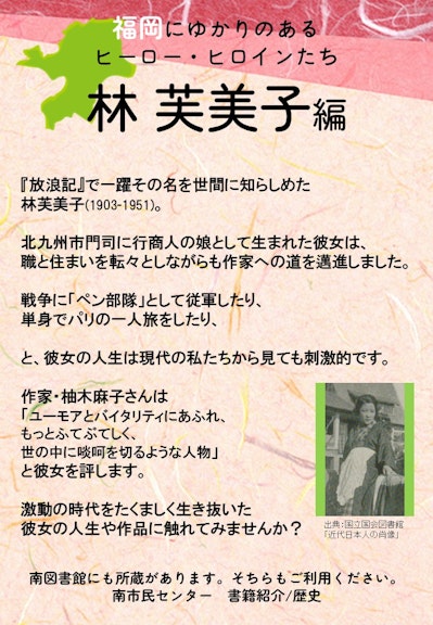 書籍紹介(歴史)「福岡にゆかりのあるヒーロー・ヒロインたち【林芙美子編】」の展示を始めました。 2026年2月1日 共通 書籍紹介(歴史)「福岡にゆかりのあるヒーロー・ヒロインたち【林芙美子編】」の展示を始めました。